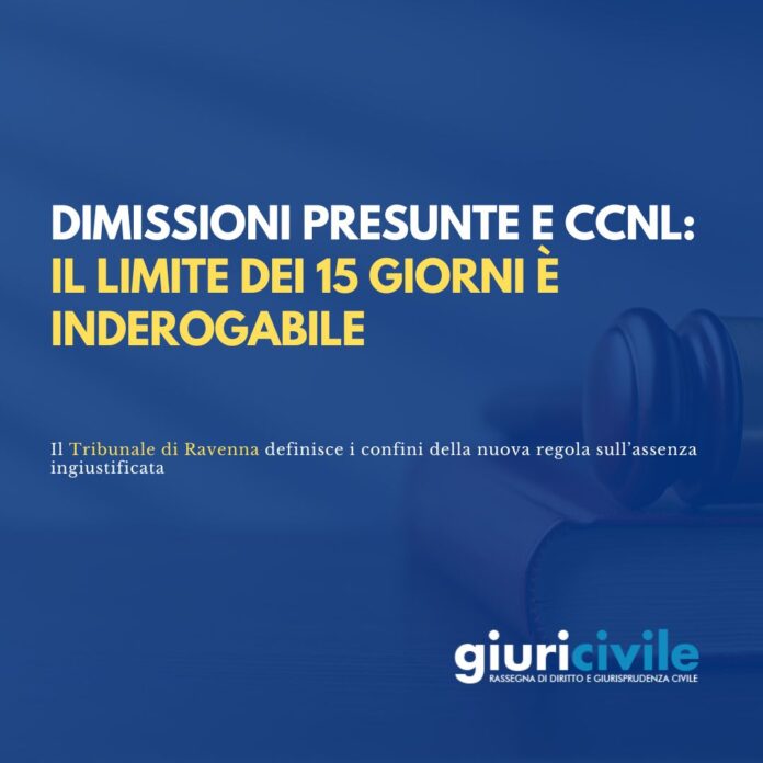 L’art. 26, comma 7-bis, del D.Lgs. 151/2015, recentemente introdotto dalla Legge n. 203/2024, ha creato un nuovo scenario nel diritto del lavoro, prevedendo una forma di risoluzione automatica del rapporto per presunta volontà del lavoratore in caso di assenza ingiustificata protratta. La Sentenza n. 441 dell’11 dicembre 2025 del Tribunale di Ravenna interviene per definire con precisione l’ambito di applicazione di questa novità, risultando di fondamentale interesse perché non si limita ad applicare la norma, ma ne traccia i confini interpretativi in un’ottica costituzionalmente orientata. La pronuncia stabilisce che il termine legale di quindici giorni non è un semplice parametro suppletivo, bensì un criterio inderogabile di ragionevolezza necessario per coordinare il nuovo istituto delle dimissioni presunte con il tradizionale licenziamento disciplinare.