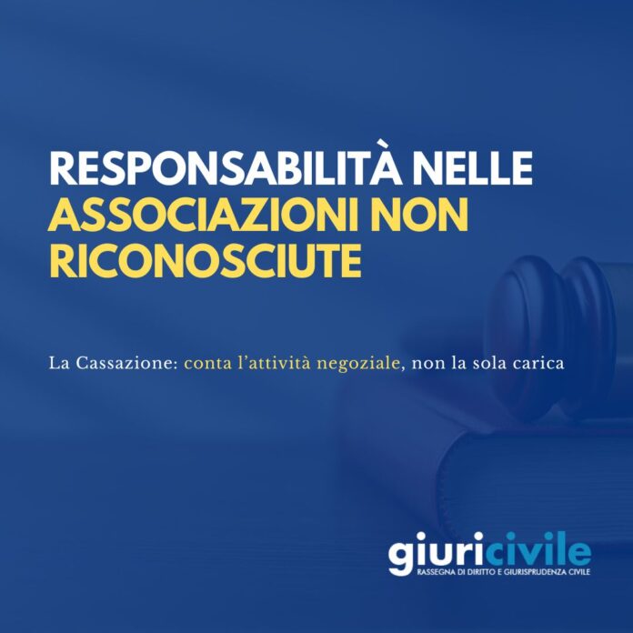 La Corte di Cassazione, con l’ordinanza n. 1679 del 26 gennaio scorso (clicca qui per consultare il testo integrale della decisione), ha statuito che la responsabilità, ai sensi dell’art. 38 c.c., presuppone un’attività negoziale posta in essere da colui che agisca in nome e per conto dell’associazione non riconosciuta creando rapporti obbligatori tra questa ed i terzi; di conseguenza, tale responsabilità non è collegata alla mera titolarità di rappresentare l’associazione, bensì all’effettiva attività negoziale svolta per conto di essa.