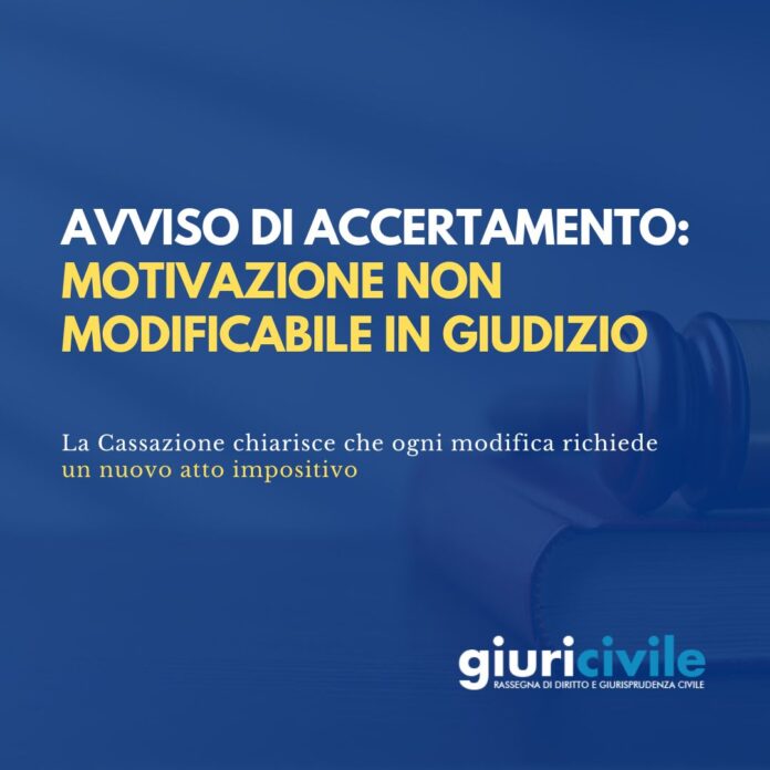 La motivazione dell’avviso di accertamento delimita il perimetro del giudizio e non può essere modificata o integrata nel corso del processo mediante l’introduzione di nuovi presupposti di fatto o ragioni giuridiche; qualora l’Amministrazione intenda fondare la pretesa su elementi sopravvenuti, è tenuta ad adottare un nuovo atto impositivo, autonomamente motivato.