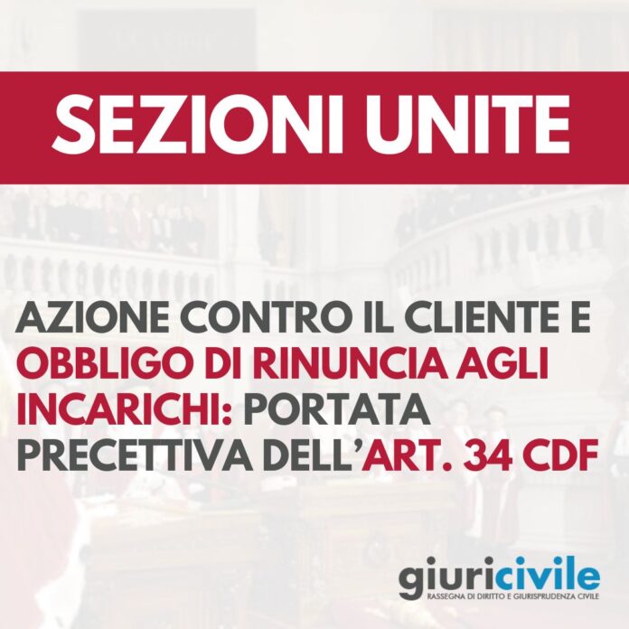 Le Sezioni Unite hanno confermato l’impostazione del CNF, ribadendo la portata precettiva inderogabile dell’art. 34 CDF. La norma, come precisato sopra, nella sua formulazione vigente, impone all’avvocato di rinunciare previamente a tutti gli incarichi ricevuti dal cliente prima di promuovere azioni giudiziarie nei suoi confronti per ottenere il pagamento del compenso.