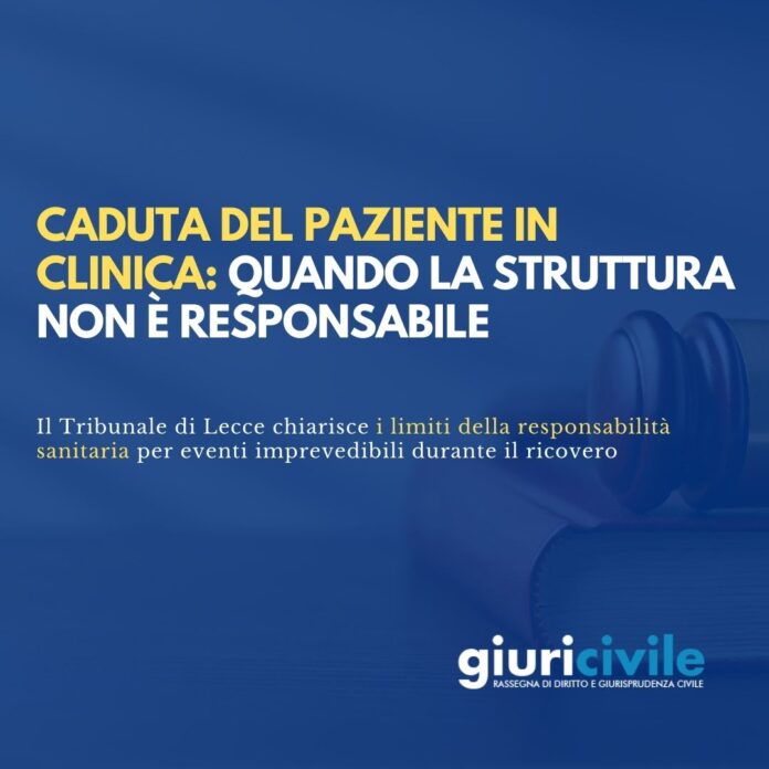 Il Tribunale di Lecce, con la sentenza n. 388/2026 (puoi leggerla cliccando qui), ha affrontato il tema della responsabilità della struttura sanitaria per la caduta di un paziente ricoverato, chiamato a stabilire se la casa di cura e il primario avessero omesso le cautele e gli obblighi di vigilanza necessari a prevenire l’evento lesivo. La decisione offre l’occasione per ribadire i presupposti della responsabilità sanitaria di natura contrattuale e, in particolare, i criteri probatori relativi al nesso causale tra condotta dei sanitari e danno lamentato dal paziente.