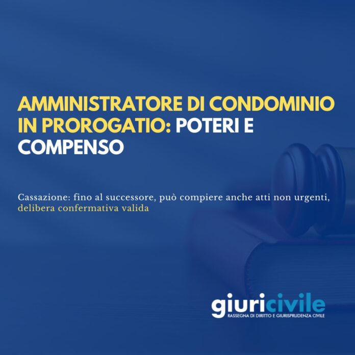 In materia condominiale, l’amministratore cessato dall’incarico per dimissioni o scadenza rimane, in regime di prorogatio, titolare di tutte le attribuzioni previste dall’art. 1130 c.c. fino alla nomina del successore, salvo espressa e contraria volontà dell’assemblea. In tale periodo egli è legittimato a porre in essere anche atti di gestione non urgenti e a percepire il compenso approvato dall’assemblea, non essendo la prorogatio limitata a una gestione meramente interinale. La deliberazione assembleare che confermi tali poteri ha natura ricognitiva e non integra causa di invalidità.