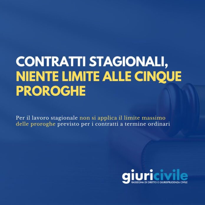 La Corte di Cassazione, Sezione Lavoro, tramite la sentenza n. 11269 depositata il 27 aprile 2026 (puoi leggerla cliccando qui), interviene sulla questione se il limite massimo di cinque proroghe nell’arco di trentasei mesi, previsto per i contratti a tempo determinato, risulti applicabile finanche ai contratti stipulati per lo svolgimento di attività stagionali. La risposta dei giudici di legittimità è negativa, spiegando che tale limite non si applica ai rapporti stagionali, essendo strutturalmente e normativamente sottratti al vincolo temporale dei 36 mesi.