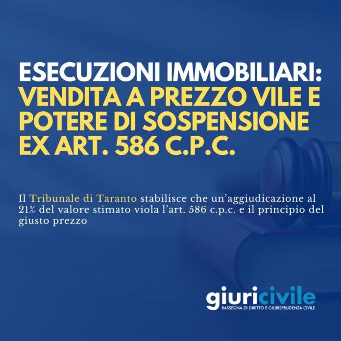 Il Tribunale di Taranto, con una recente sentenza innovativa (clicca qui per consultare il testo integrale), ha approfondito il tema del sindacato giudiziale concernente la congruità del prezzo di aggiudicazione nell’ambito delle espropriazioni forzate immobiliari. La decisione delinea un percorso ermeneutico volto a conferire concretezza alla clausola generale di “prezzo notevolmente inferiore a quello giusto”, contenuta nell’art. 586 c.p.c.. Il fulcro della pronuncia risiede nell’esercizio del potere di sospensione della vendita attraverso un’applicazione per analogia legis di istituti esterni al perimetro del processo esecutivo. In tal modo, l’organo giudicante perviene alla formulazione di un criterio quantitativo per la valutazione della “viltà” del prezzo, rafforzando i presidi di tutela a favore del debitore esecutato avverso gli esiti distorsivi e potenzialmente speculativi della procedura.