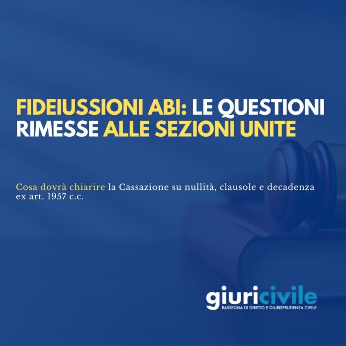Il Primo Presidente della Corte di Cassazione, con il provvedimento dell’11 novembre 2025 (che puoi leggere cliccando qui) e a seguito del rinvio pregiudiziale del Tribunale di Siracusa, ha rimesso alle Sezioni Unite alcune questioni centrali in materia di fideiussioni bancarie che riproducono lo schema ABI censurato dalla Banca d’Italia nel 2005. La rimessione nasce dal persistente contrasto giurisprudenziale su nullità delle clausole, efficacia della riproduzione del modello ABI e limiti operativi dell’art. 1957 c.c. nell’esercizio del credito garantito.