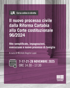 A due anni dalla Riforma Cartabia, il processo civile italiano continua a essere interessato da interventi normativi e giurisprudenziali destinati a incidere profondamente sulla pratica forense. In questo contesto di continua evoluzione, il corso di formazione online organizzato da Maggioli Editore – “Il nuovo processo civile dalla Riforma Cartabia alla Corte costituzionale 96/2024” – rappresenta un’opportunità formativa concreta e tempestiva per professionisti del diritto. Il ciclo di quattro incontri, affidato a docenti di altissimo profilo, propone un percorso sistematico e aggiornato attraverso le principali novità del contenzioso civile, affrontando questioni tecniche e operative con un taglio pratico e interattivo.