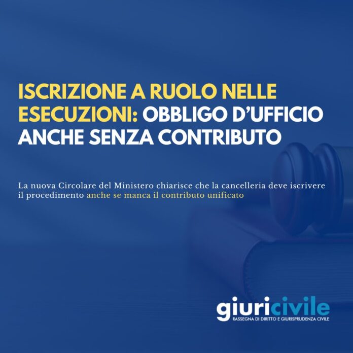 Una recente Circolare della Direzione generale degli Affari interni del Ministero della Giustizia è intervenuta sul tema dell’iscrizione a ruolo delle procedure esecutive quando il deposito del verbale proviene dall’Ufficiale giudiziario. Il chiarimento è netto: in questi casi la cancelleria procede d’ufficio all’iscrizione, anche se non risulta versato il contributo unificato minimo previsto dall’art. 14, comma 3.1, d.P.R. n. 115/2002. L’intervento si innesta sul solco tracciato dalla precedente Circolare del 24 marzo 2025 e chiude un fronte di incertezza applicativa che aveva prodotto prassi disomogenee tra uffici giudiziari e UNEP.