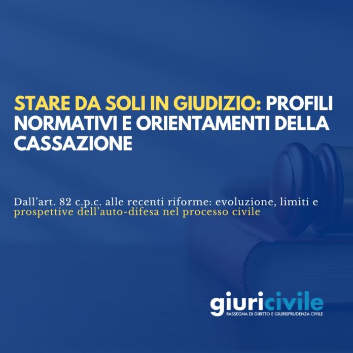 Si apre così lo spazio per affermare, in funzione declarativa delle norme codicistiche, che la parte può avere il diritto o la facoltà di stare da sola in giudizio ben al di là della previsione, in effetti alquanto limitativa, dell’art, 82 c. 1 c.p.c., riguardo appunto alla sostanza del giudizio ossia al suo oggetto.