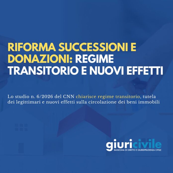 Lo studio n. 6/2026 del Consiglio Nazionale del Notariato analizza la riforma introdotta dall’art. 44 della legge 2 dicembre 2025, n. 182, soffermandosi in particolare sulla disciplina transitoria e sugli effetti sistematici delle modifiche apportate agli artt. 561, 562, 563, 2652 e 2690 c.c. Per approfondimenti, segnaliamo la pubblicazione del volume “Successioni e Donazioni dopo la riforma del 2025”, disponibile cliccando su Shop Maggioli o su Amazon.