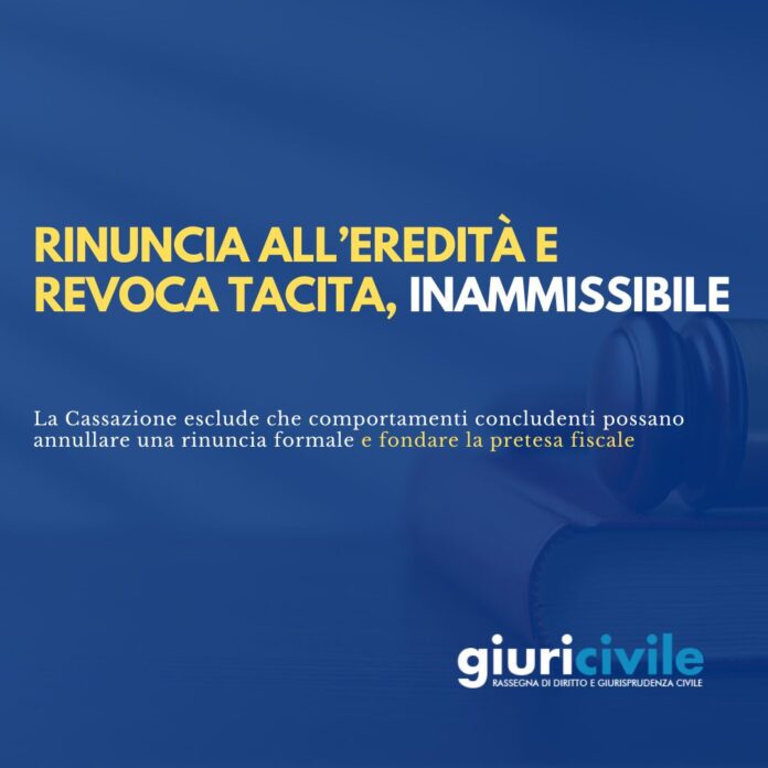 Nell’ordinanza n. 6803/2026, la Sezione Tributaria della Corte di Cassazione ha affrontato la tematica della revoca della rinuncia all’eredità in forma solenne. Nel sistema delineato dagli artt. 519 e 525 c.c., la rinuncia all’eredità, richiedendo forma solenne a pena di nullità, non può essere revocata per facta concludentia e neppure per effetto di una successiva accettazione tacita (clicca qui per consultare il testo integrale della decisione).