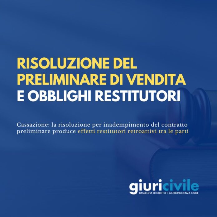 La Corte di Cassazione, con ordinanza n. 449/2026 (puoi leggerla cliccando qui), ribadisce che la risoluzione per inadempimento del contratto preliminare produce effetti restitutori retroattivi tra le parti. Ne consegue che il promissario acquirente, che abbia ottenuto la disponibilità anticipata del bene, è tenuto non solo a restituirlo, ma anche a corrispondere i frutti per il godimento medio tempore.