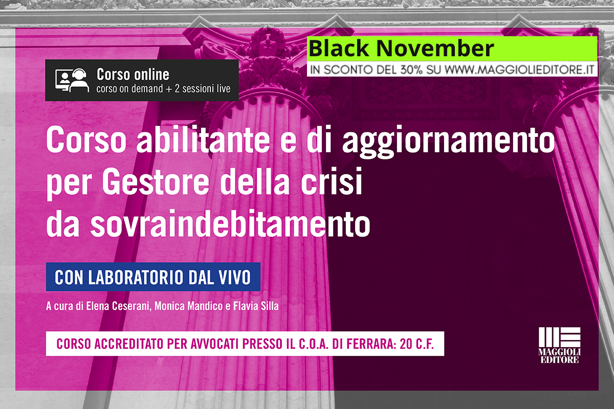 Consiglio: il Corso abilitante e di aggiornamento per Gestore della crisi da sovraindebitamento è definito dalle Linee guida generali elaborate dalla Scuola Superiore della Magistratura ed erogato ai sensi dell’art. 16 del D.P.R. 162/1982, dell’art. 4 co. 5 e 6 del d.m. 202/2014, e dell’art. 356 CCII. Permette, inoltre, la maturazione delle ore formative obbligatorie per la richiesta di iscrizione all’Albo dei gestori della crisi da sovraindebitamento per avvocati e commercialisti e per l’aggiornamento biennale (clicca qui per iscriverti).