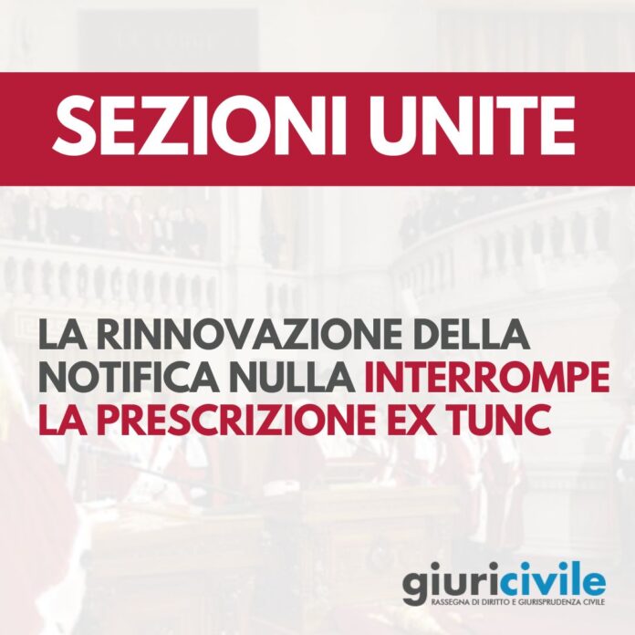 Le Sezioni Unite Civili della Cassazione, con la sentenza n. 6474/2026 (clicca qui per consultare il testo integrale della decisione), si sono pronunciate sugli effetti della rinnovazione della notifica nulla sull’interruzione e sospensione della prescrizione, ponendo fine al contrasto giurisprudenziale in materia, e chiarendo il rapporto tra disciplina processuale della notifica e istituto sostanziale della prescrizione.