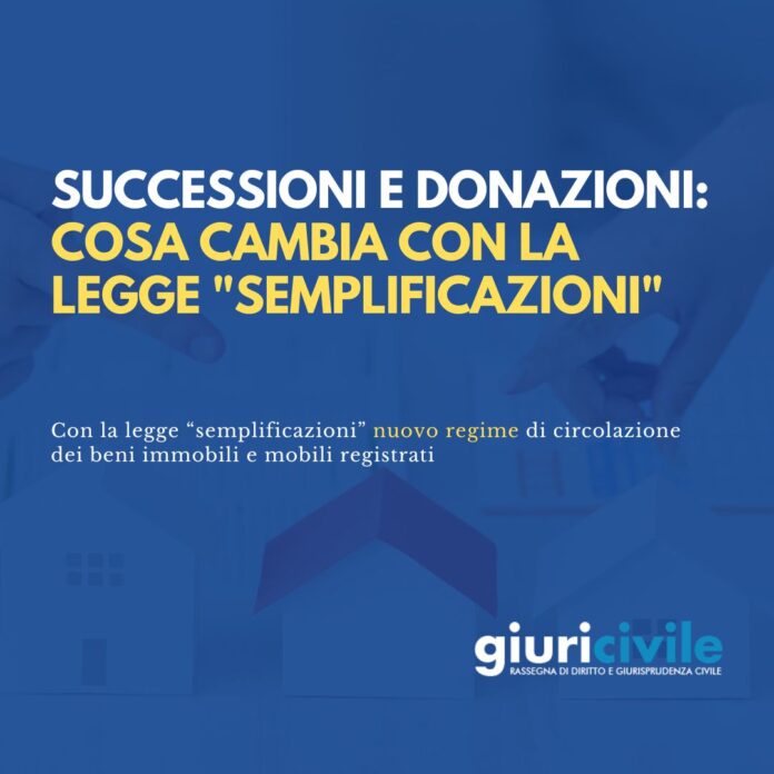 La legge cd. “semplificazioni 2025”, approvata in via definitiva dal Parlamento, e dal 3 dicembre in Gazzetta Ufficiale (Serie Generale n.281 del 03-12-2025), modifica alcuni articoli del codice civile in materia di successioni e donazioni. L’intervento normativo intende sbloccare il mercato degli immobili di provenienza donativa, sostituendo l’obbligo di restituzione in natura con un meccanismo di indennizzo economico per il legittimario leso. Al contempo, vengono semplificati gli iter per la trascrizione dell’accettazione tacita di eredità, rafforzando la certezza del diritto e l’affidamento dei terzi. La disciplina si estende anche ai beni mobili registrati (es. autoveicoli, navi, aeromobili), ampliando l’ambito applicativo della riforma.